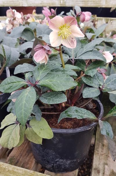 Lenten Rose. Light pink to pink flowers mature to a deep cranberry. Very dark foliage with dark stems. Strong plant, deer resistant. Grow in good well-drained soil in part shade.