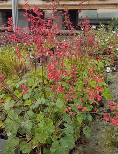 Coral Bells. A mound of red leaves with dark scarlet flowers in open panicles in summer. Height up to 2ft. Flowers from June to August. Semi-evergreen.