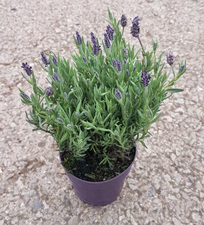 Lavender. An aromatic evergreen shrub with narrow, grey leaves. Large rounded, purple flowerheads with conspicuous bracts are borne through summer. Height 70cm. Needs well drained soil in sun.