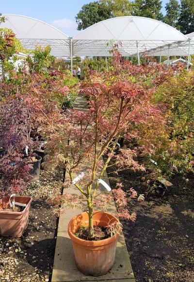 Japanese maple for the Patio. A petite, slow growing Japanese maple. Forms a compact globe of small red leaves that turn maroon in the Summer. Height 4 - 5 ft.